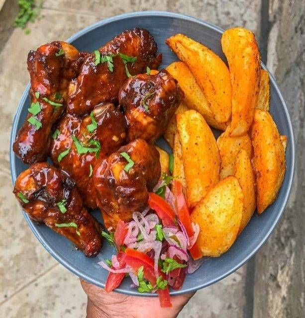 Bbq chicken wings, roast potatoes and kachumbari