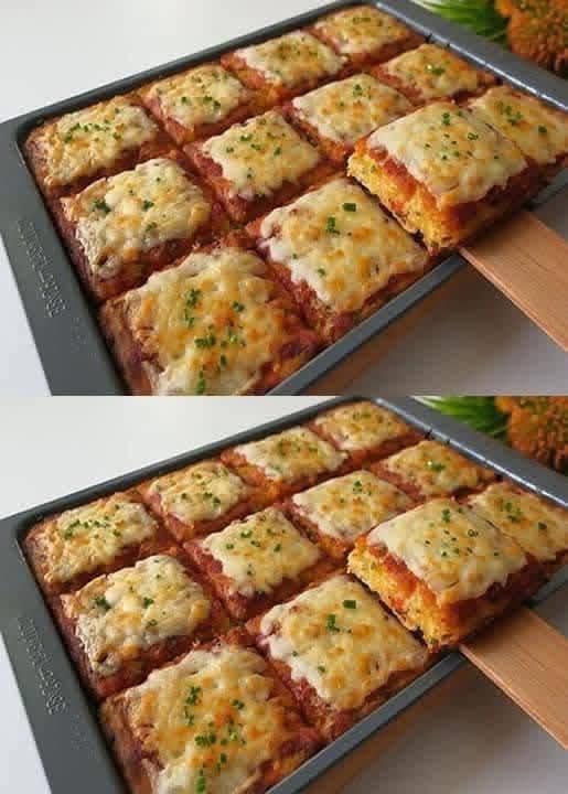 After baking, brush tomato sauce over the surface, cut into square portions, and sprinkle with shredded cheese (mozzarella or Parmesan). Return to the oven for 10 minutes to melt the cheese.